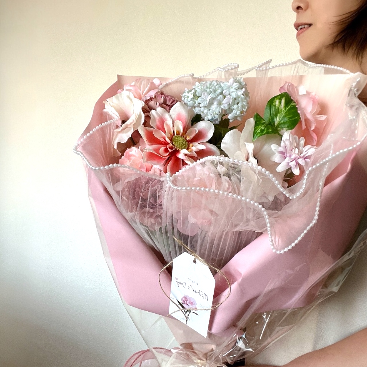アーティフィシャルフラワーgift専門店、フラワーパレットです。商品をご覧頂きありがとうございます。上品で優しいピンクのカーネーションは本物のカーネーションと見間違うほど美しく品質の高いお花です。柔らかな優しいピンクの雰囲気をそのままお母さんにお届けして欲しい!そんな思いをラッピングにも込めて丁寧におつくりしました。暑い夏の季節にも枯れずに残せる花、アーティフィシャルフラワーのプレゼントは、お花は好きだけれど管理が苦手なお母さんの贈り物にもおすすめです。メンテナンスはお花についたホコリを柔らかなブラシで払うだけです。ずっと綺麗な花のままで長く飾って欲しい!おしゃれなクラフトバッグにピンクの花束を詰めてお送りいたします。ぜひ母の日にご利用くださいね。