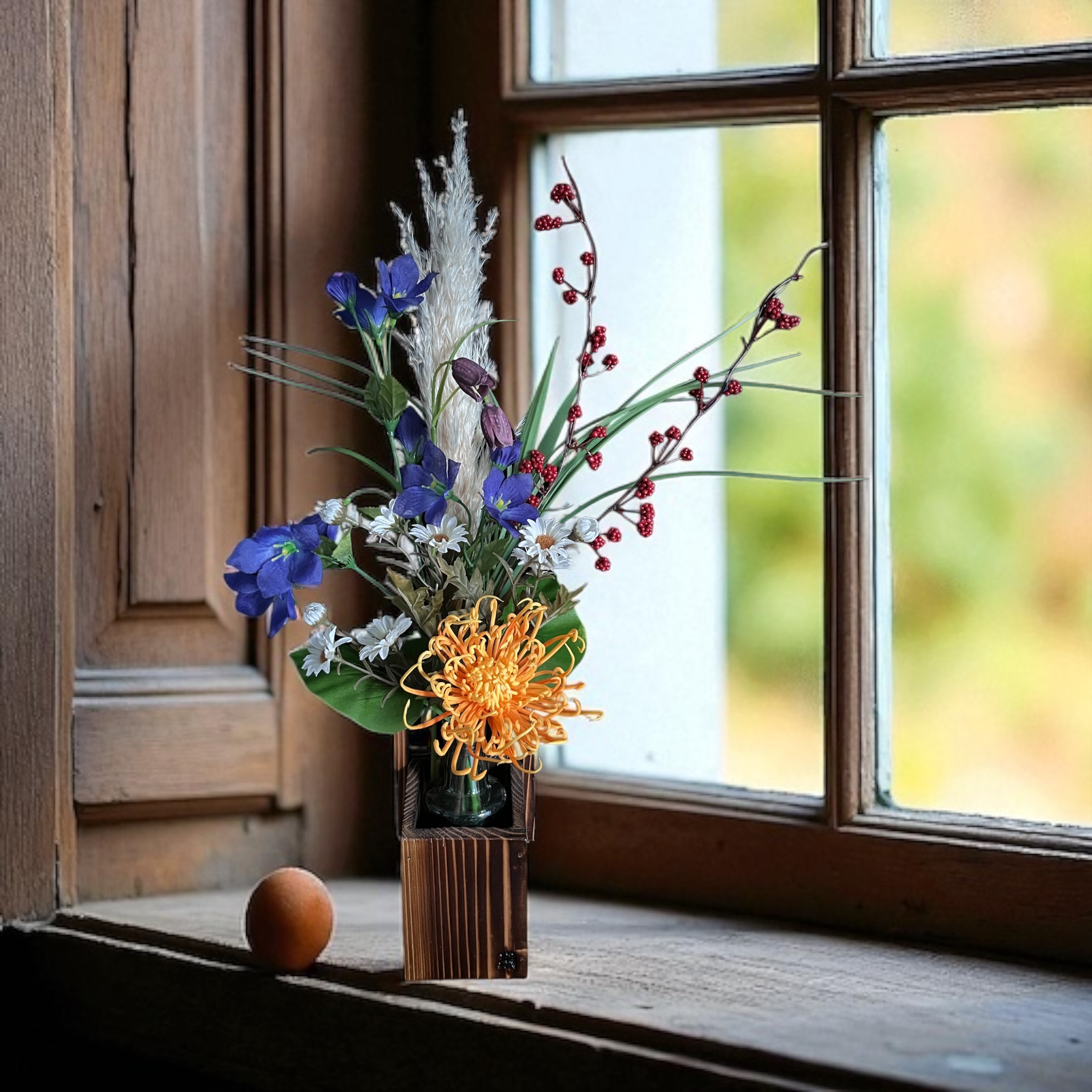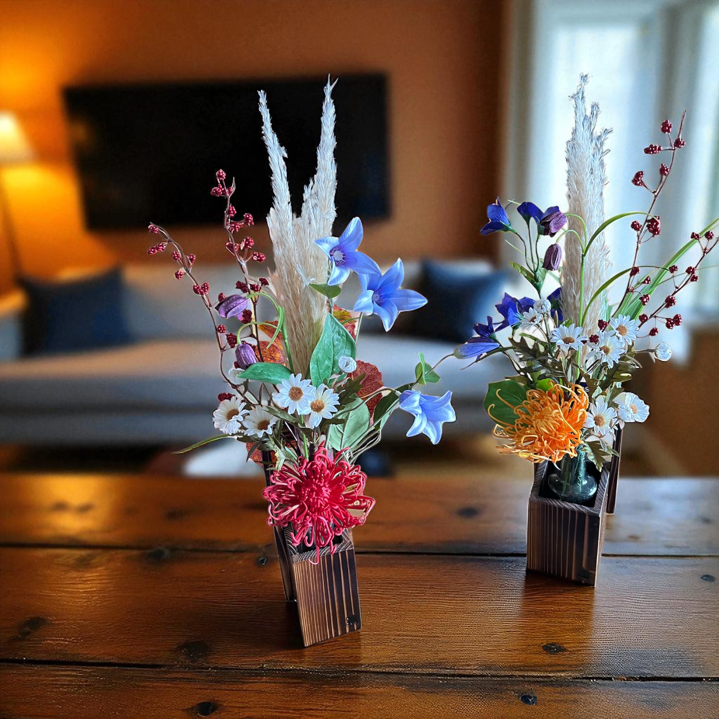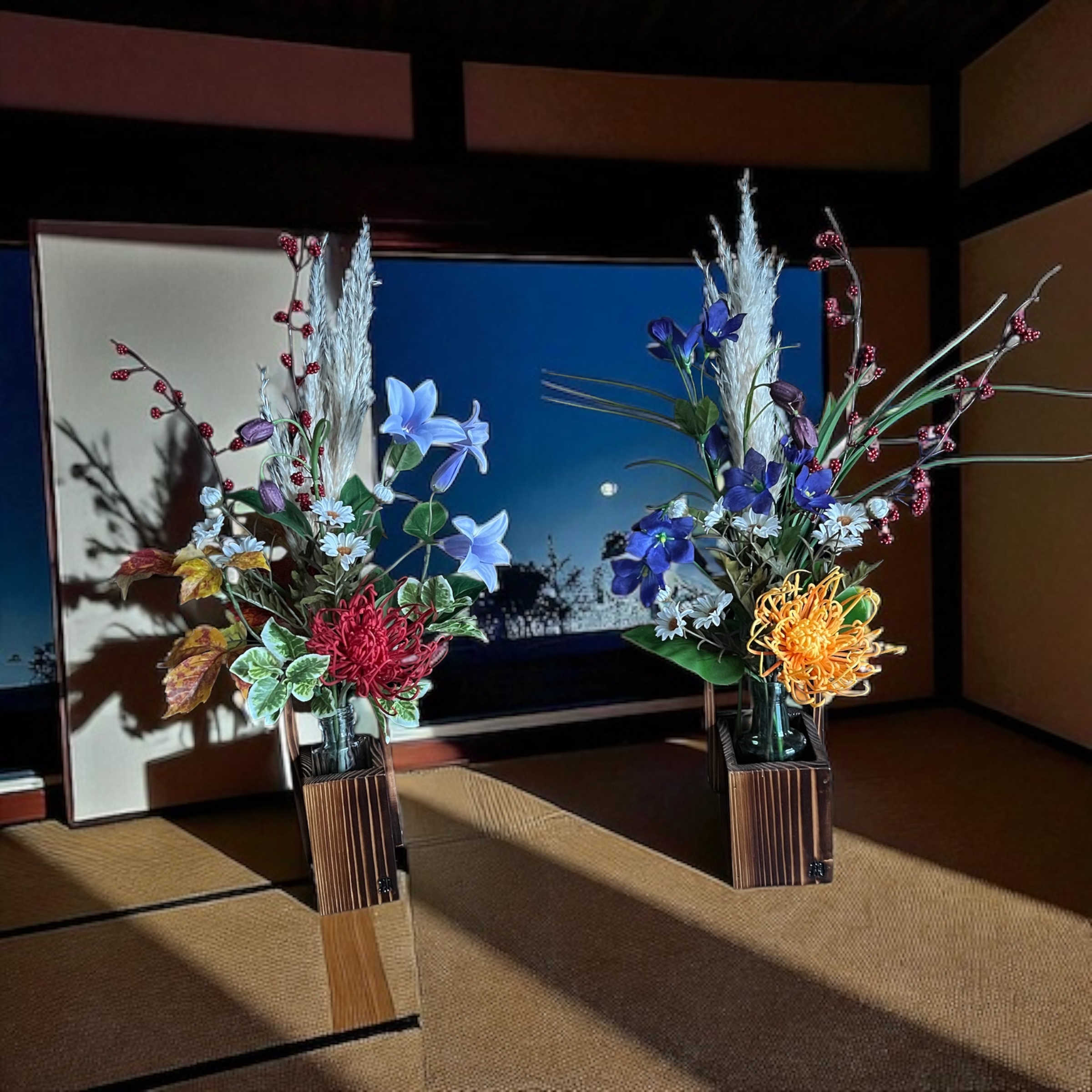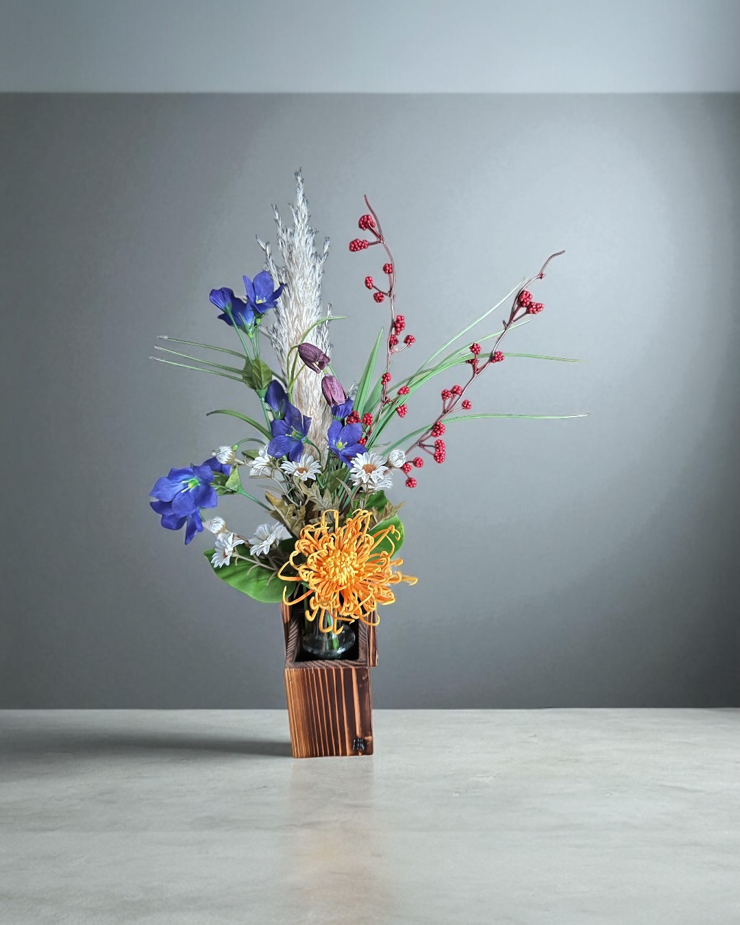 高品質な造花・アーティフィシャルフラワーの和花を木製一輪挿し花器に入れたSET品です。
