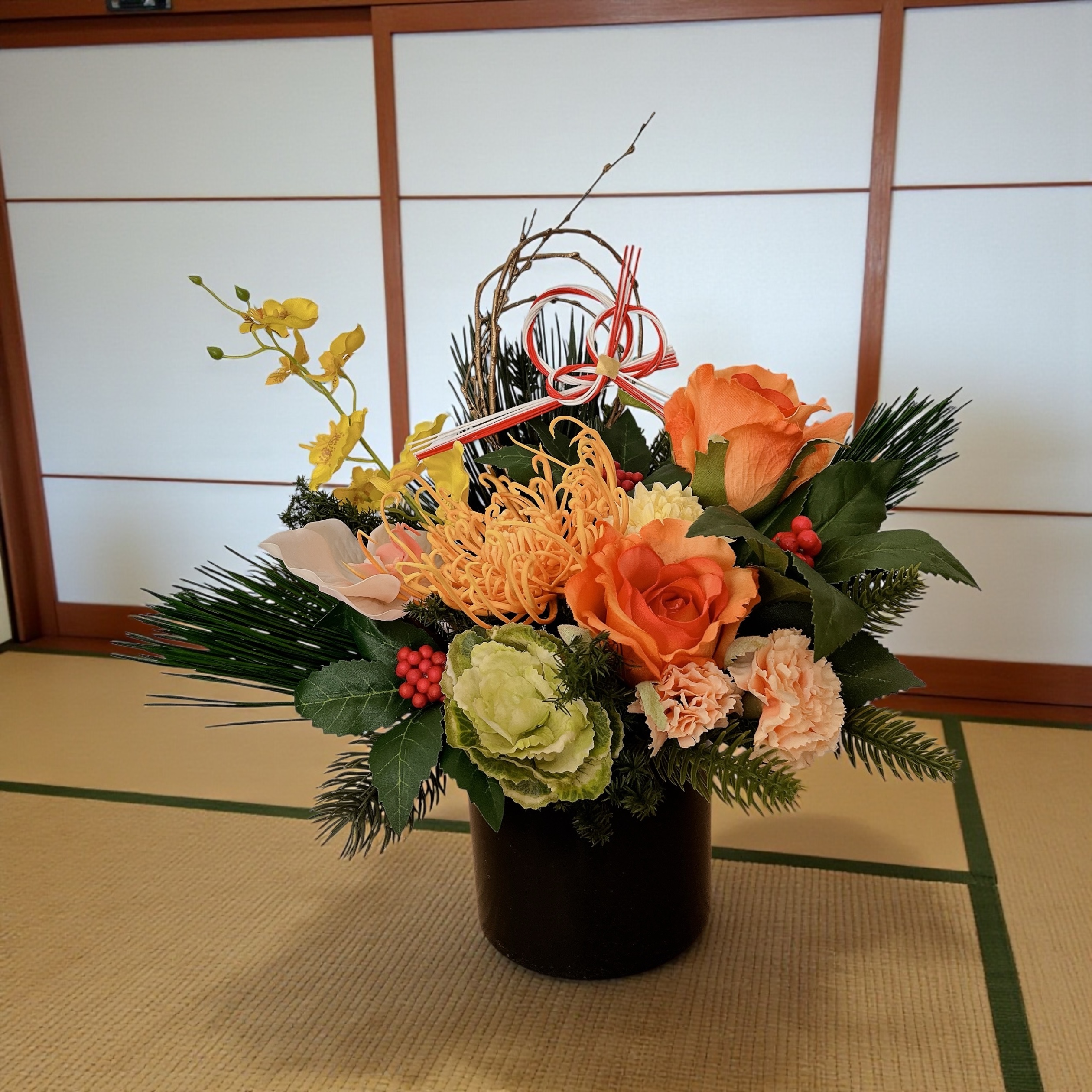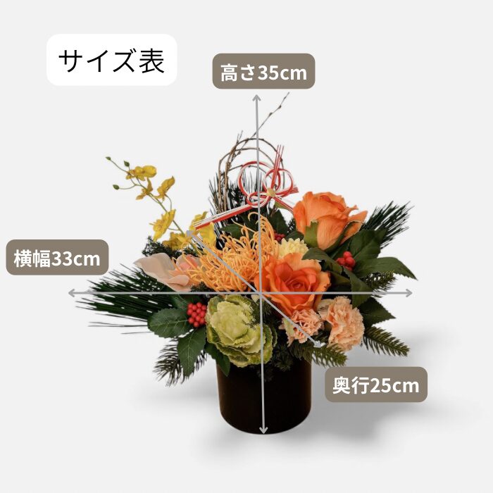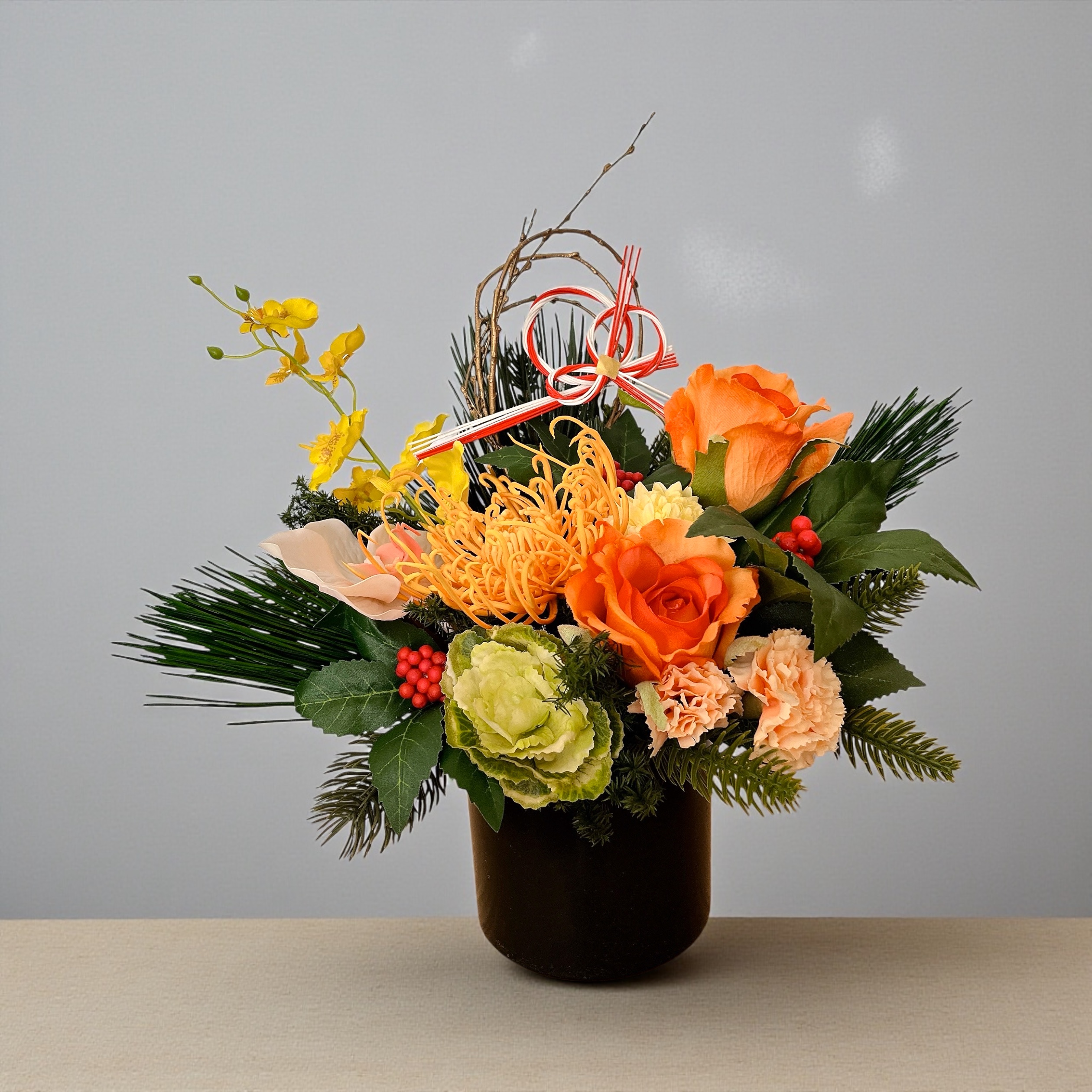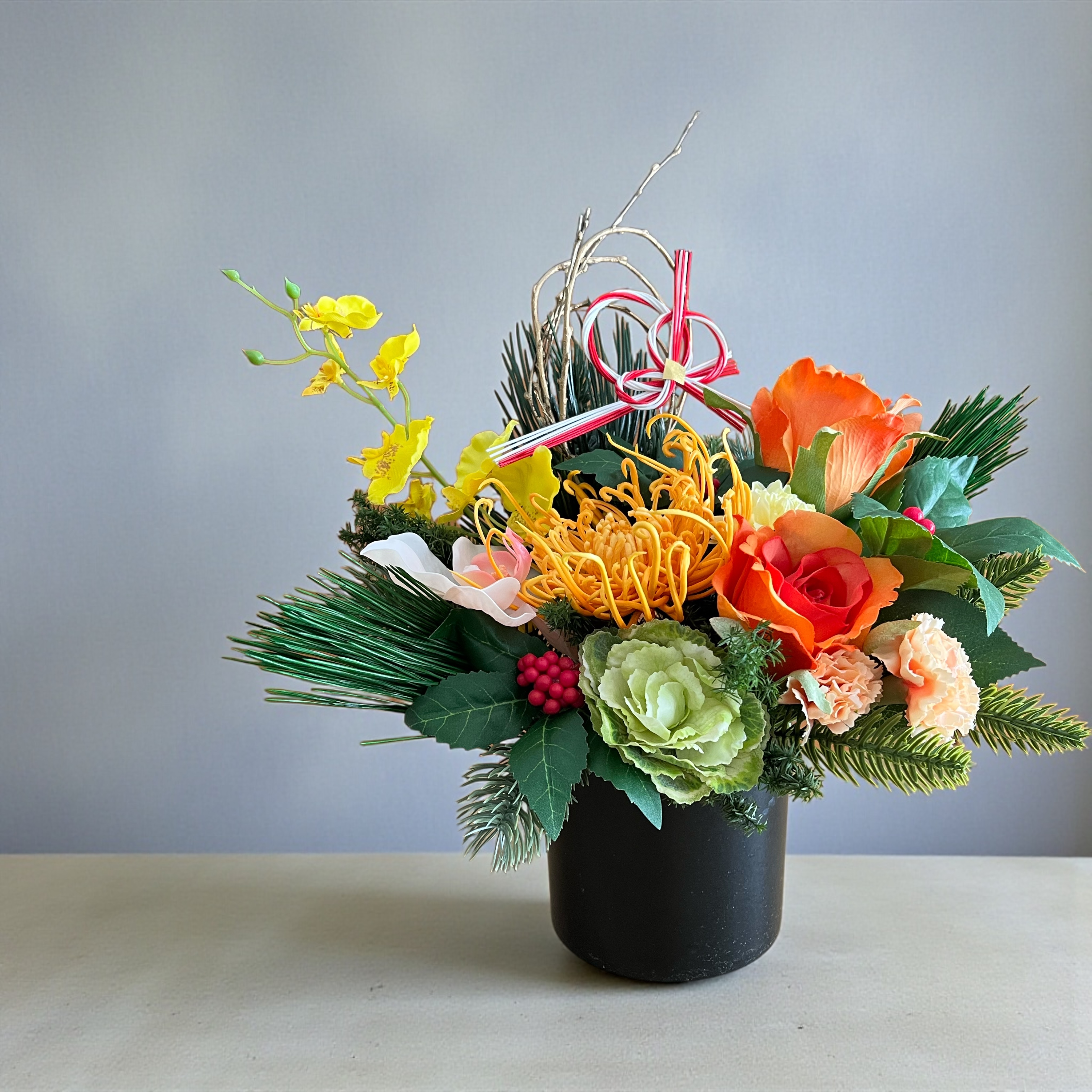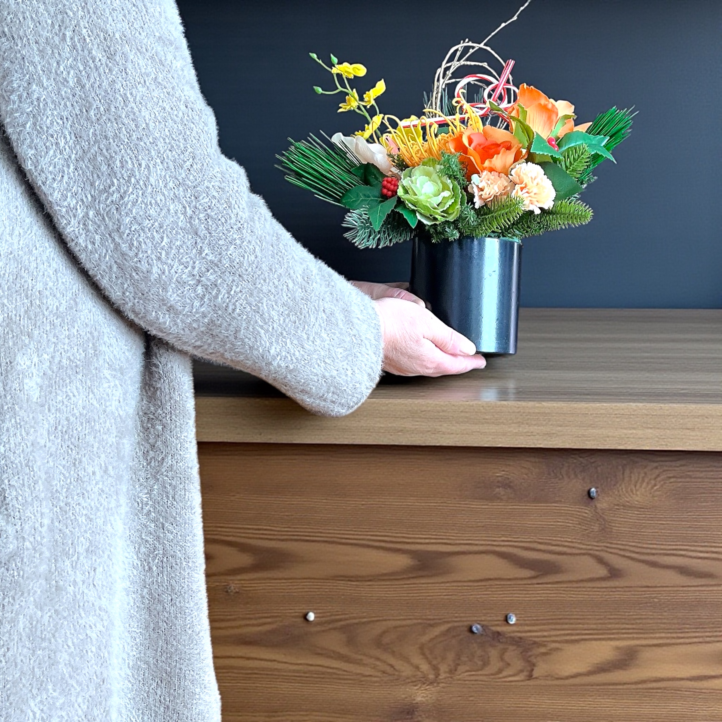 お正月用のアレンジメントにラッキーカラーのオレンジ色を入れて華やかさをUPしました。お部屋のどこの飾ってもパッと目を惹くオレンジ色は明るく元気が出そうなパワーが溢れています。お玄関やテーブル、又お仏壇の写真立ての横に、、など様々な場所にも飾りやすいサイズ感も人気です。温度や湿度に関係なくいつまでも美しい花をキープするアーティフィシャルフラワーのお正月花を飾って、パワー溢れる新年をお迎えくださいね。