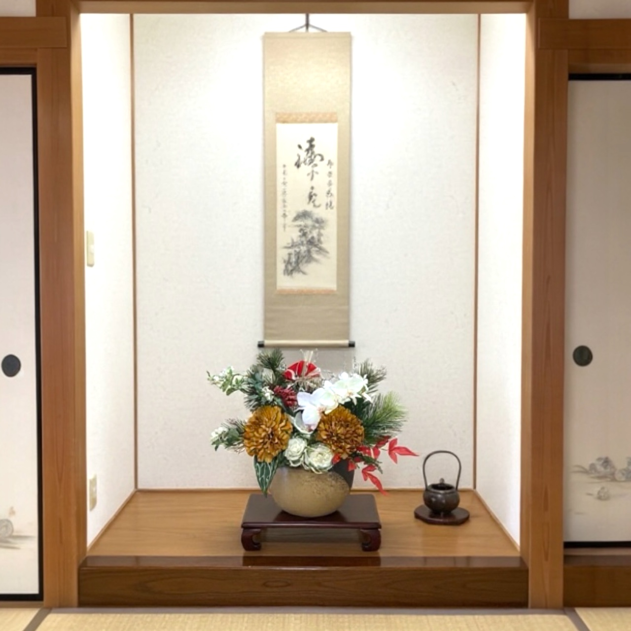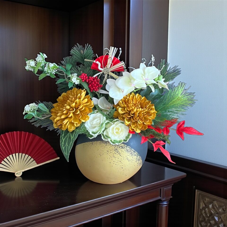 フラワーアレンジメントです。シックな花器と和モダンスタイルのお正月花は、日本家屋の床の間にも