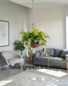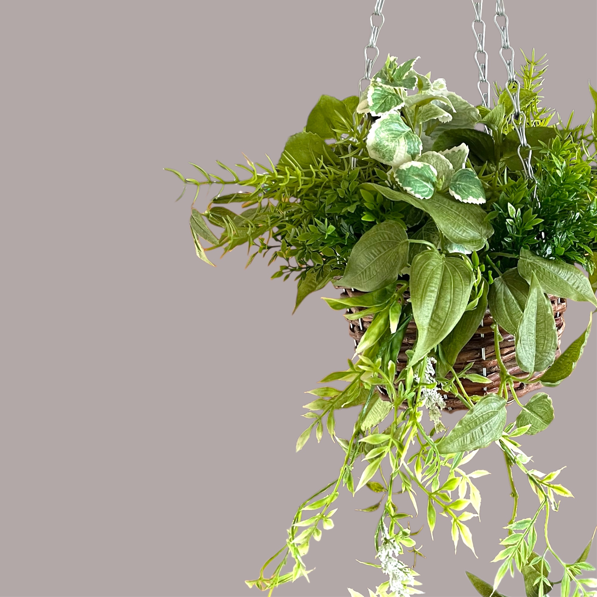 ♦︎こちらの作品【フェイクグリーン〜ハーブガーデンハンギング〜】は品質の高いアーティフィシャルグリーンでおつくりした枯れない観葉植物のハンギングバスケットです。吊るすだけで涼しげなインテリアになるおしゃれなグリーンです。