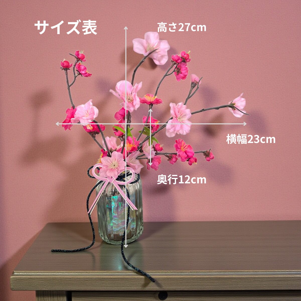 こちらの「梅桃一輪挿しSET」の商品はガラスベースに品質の高い造花・アーティフィシャルフラワーの梅と桃の枝物を挿した花瓶と花のSET品です。ガラスベースの中にキラキラと光るセロファンを入れております。
