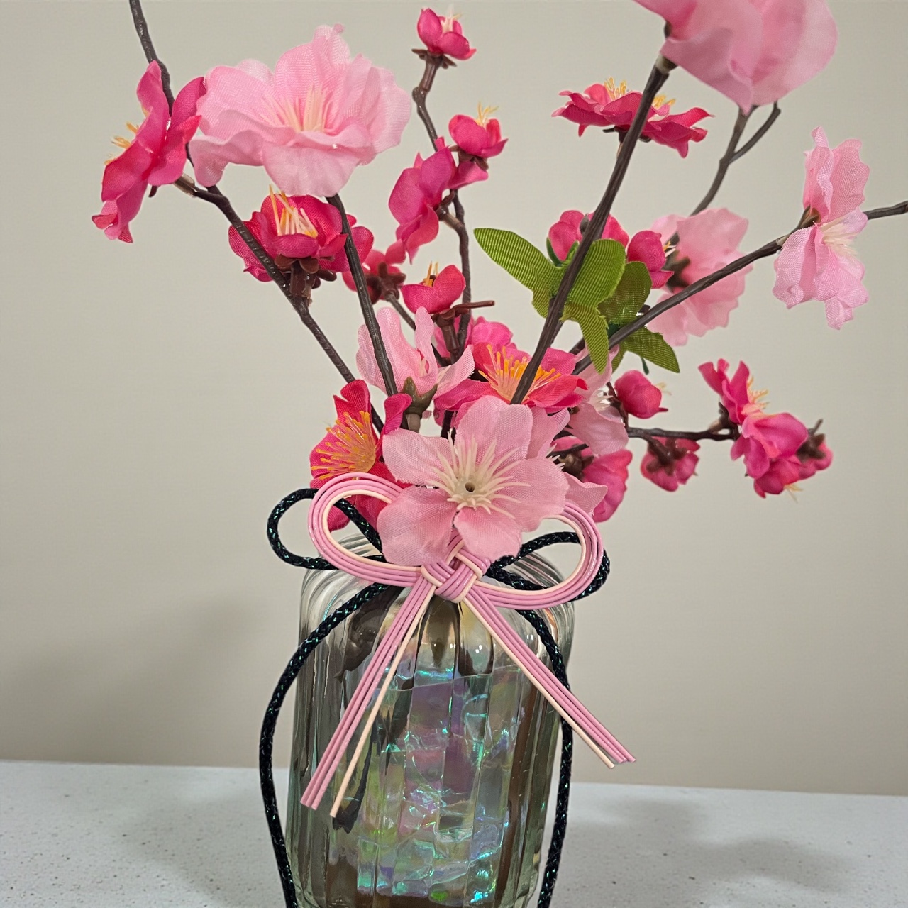 濃いピンクの梅の花と淡く可愛いピンクの桃の花!一緒にガラスベースに生けると濃淡がとても可愛かったので