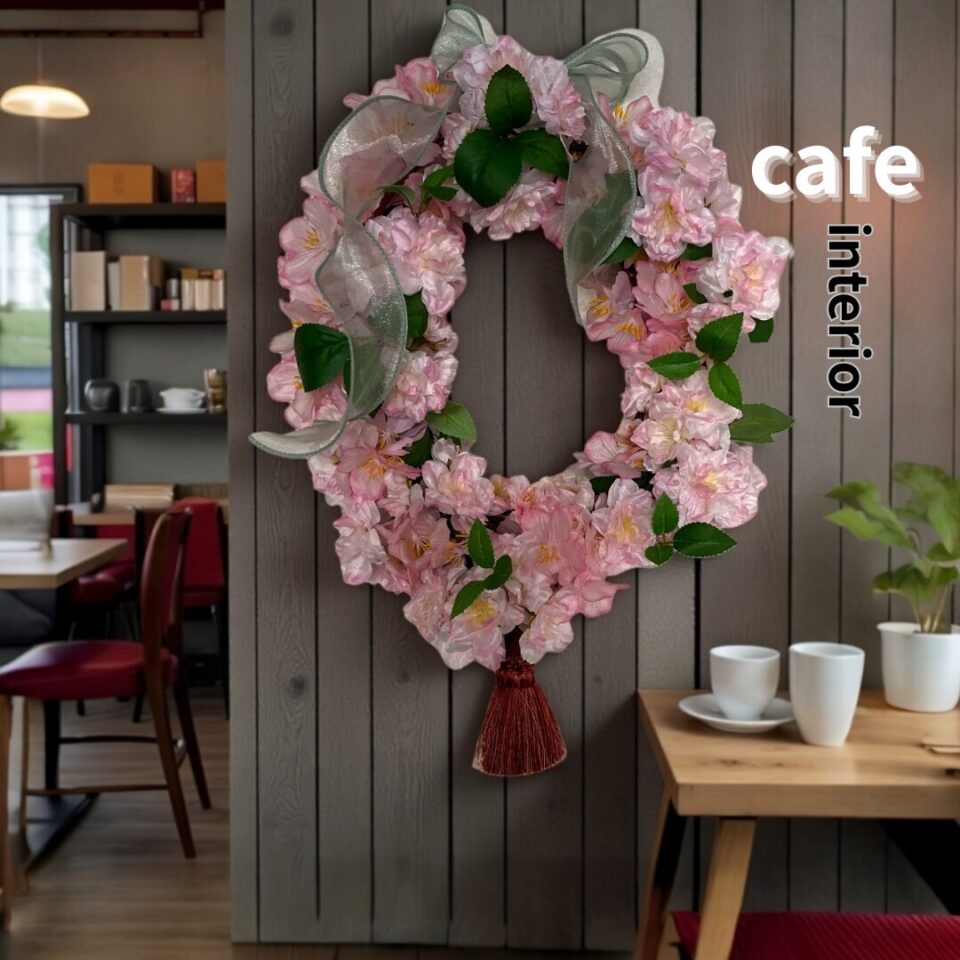 ふんわりと優しいピンク色の桜、もこもことした八重桜をミックスしてお作りしたリースはいち早く春を感じるインテリアアイテムにおすすめの作品です。他のお花を混ぜずに桜だけで作ったリースは色合いがとても優しく癒されます。日本の春を代表する花・桜は誰もが見ているだけで優しい気持ちに、笑顔になります。まるで本物の桜のようなアーティフィシャルフラワーの桜リースをお家の中でもお花見気分で楽しんで頂ければ、、そんな気持ちを込めて丁寧に作りました。春のインテリア空間にぜひご利用くださいね。