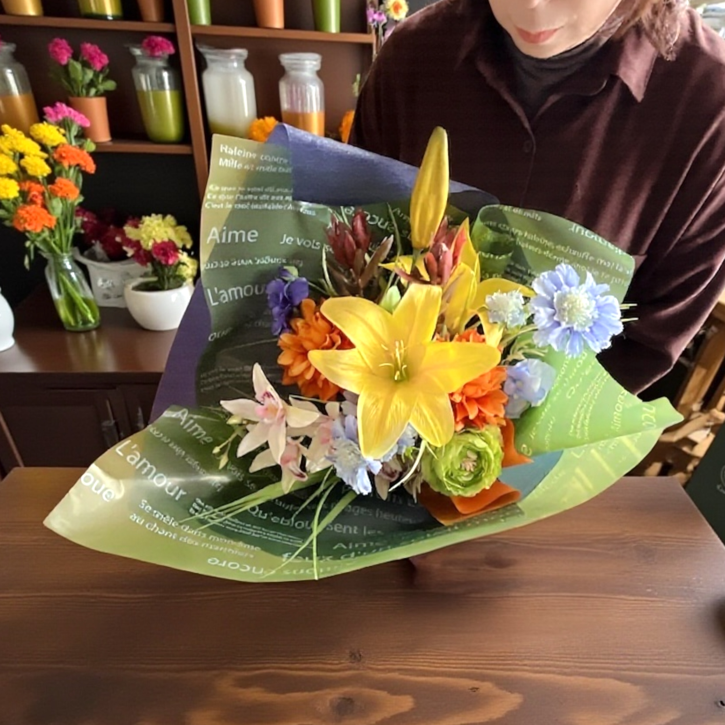 ♦︎こちらの【送別餞別の花束】は送別、退職祝い、異動など職場の上司や同僚、大切な友人、知人への感謝の気持ちや門出を祝うために特別に作られた花束です。高品質な造花・アーティフィシャルフラワーを使用していますので、花束を貰った後もインテリアフラワーとして飾りやすいデザインになっています。男性への餞別の花としてもおすすめです。黄色やオレンジ・ブルー系で束ねた明るい色合いの花束です。
