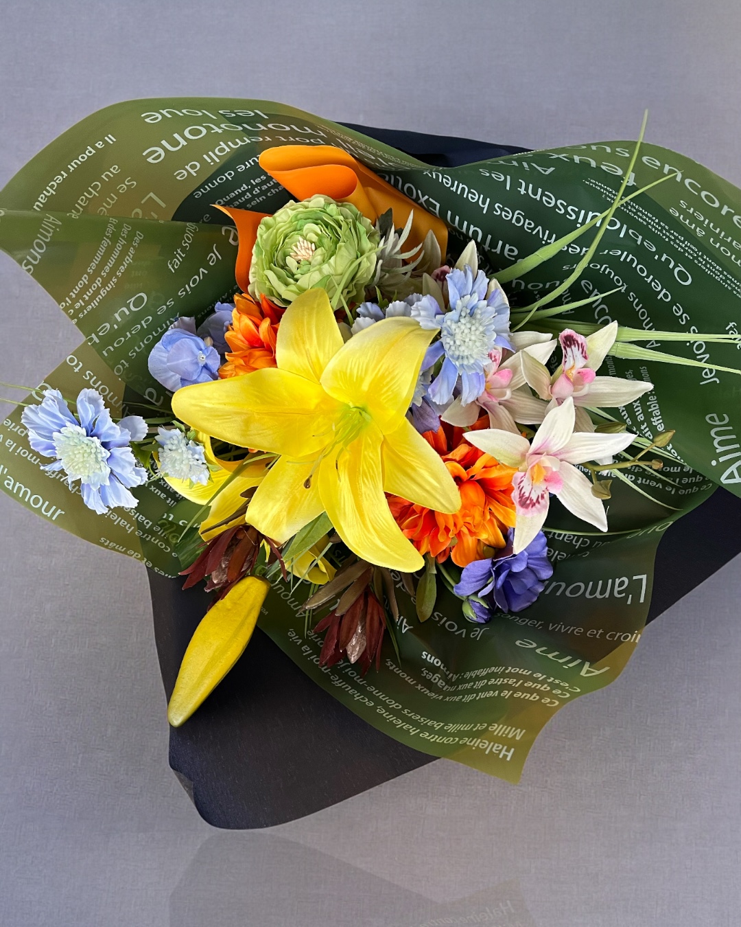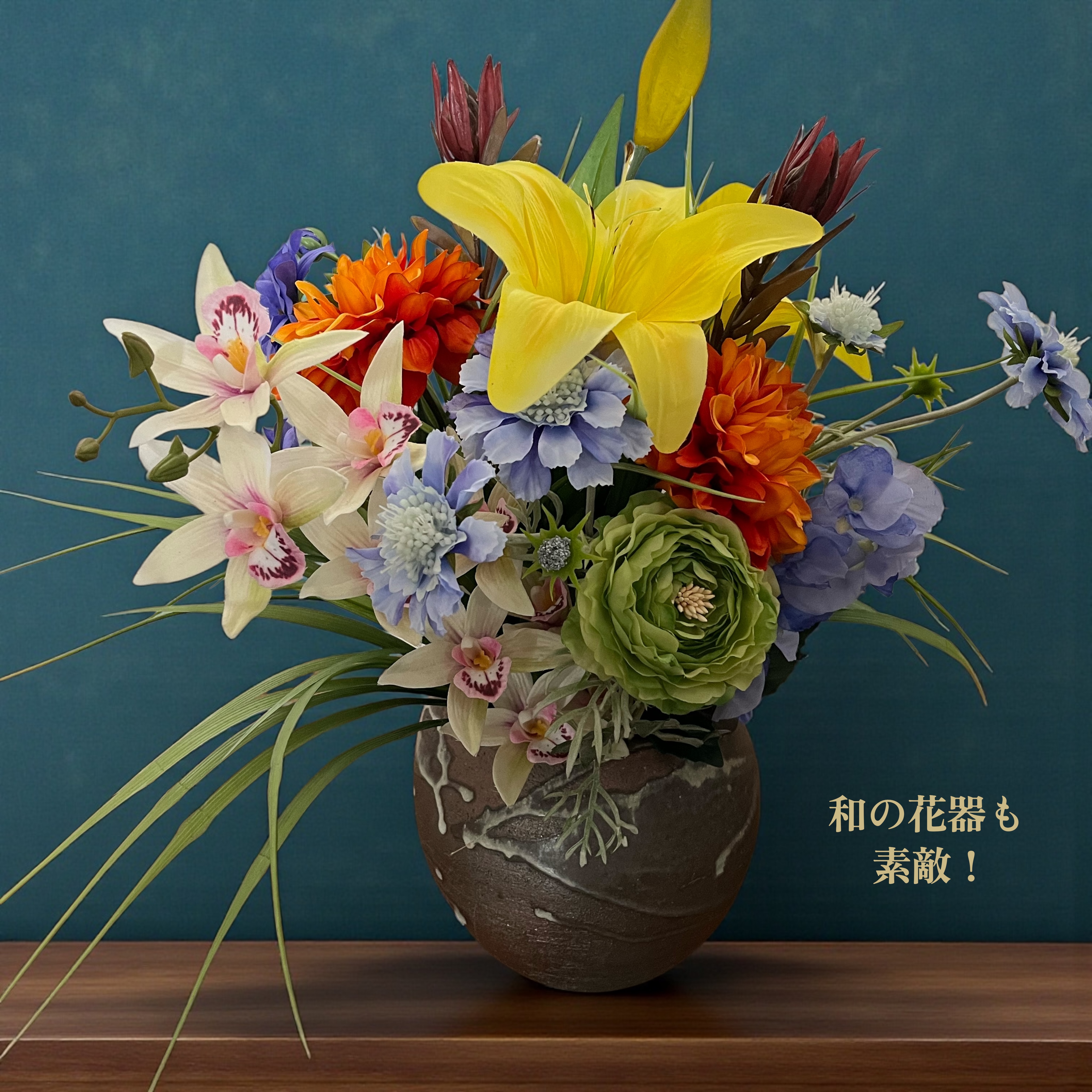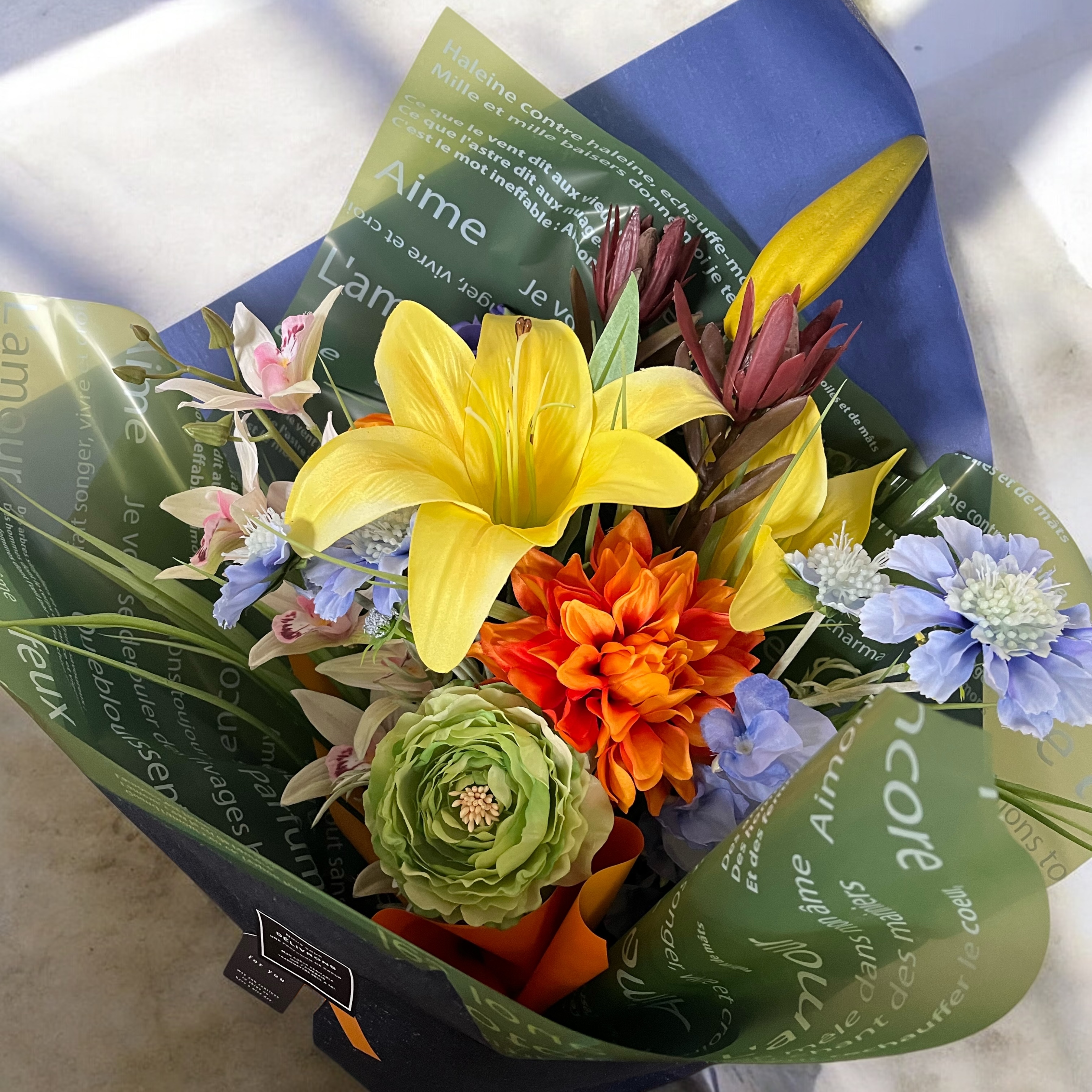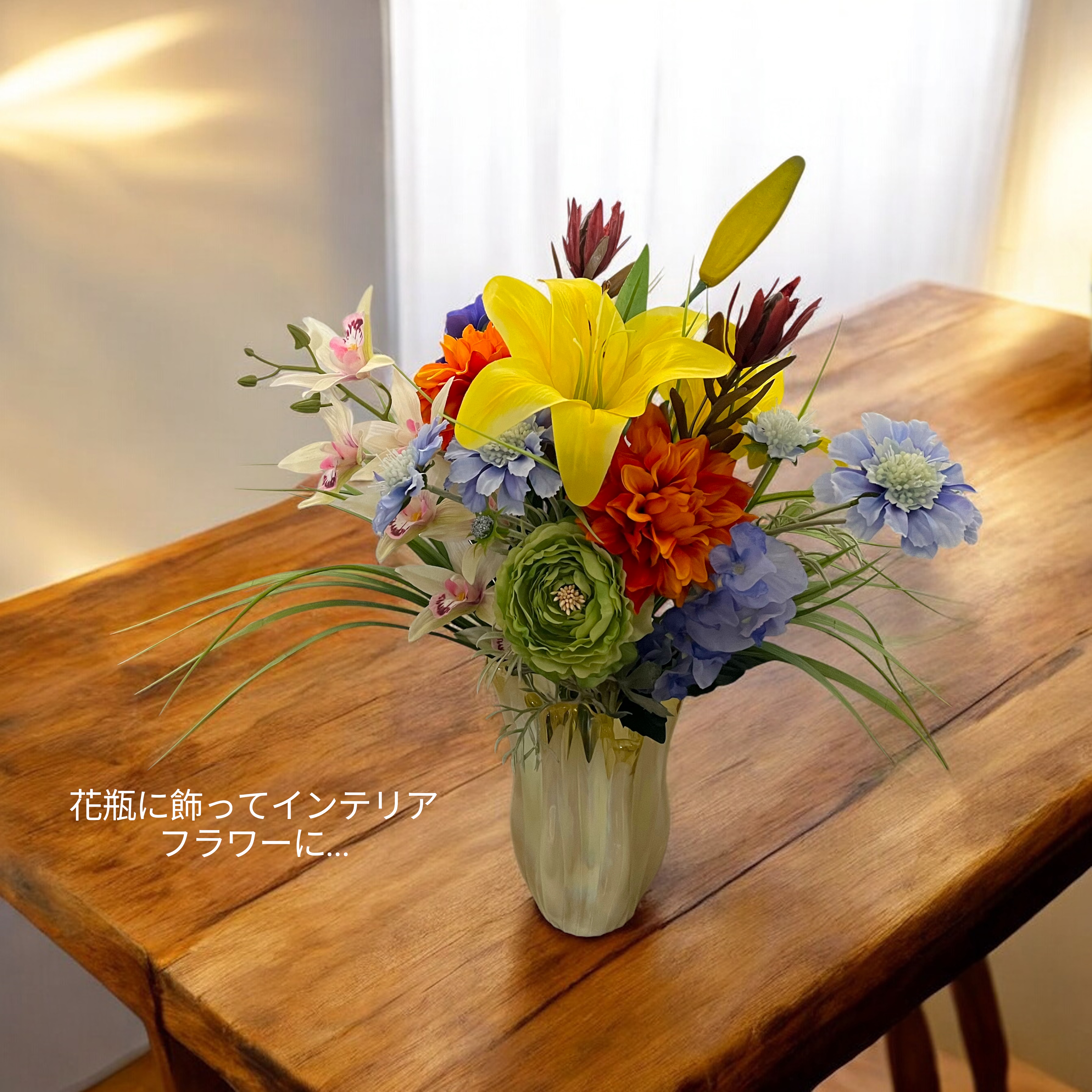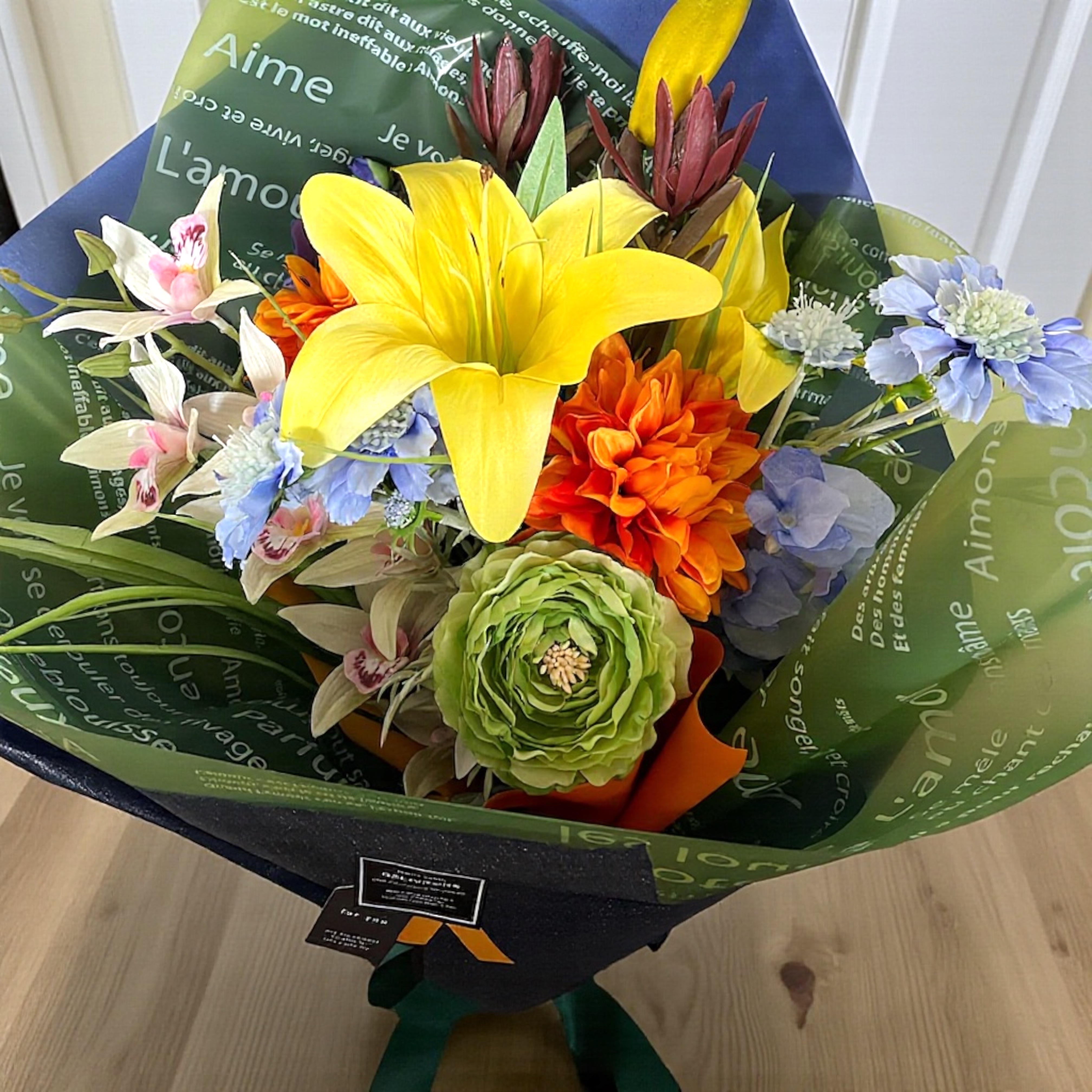 こちらの【送別餞別の花束】を作った理由は、お客様から「男性の上司に花束は迷惑でしょうか?」と問い合わせがあったことがきっかけでした。私も気になっていたのでググって調べたところ、「こんな機会がないと花束なんて貰わないから以外と嬉しかった。」「やっぱり花は綺麗だし貰って嬉しくないことはない!」など、予想と反して好反応だったこともあり、お客様にお伝えし、イエローブルー系でお作りしたことがありました。大変喜んで頂けたと感想を頂け嬉しかったです。生花と違い、アーティフィシャルフラワーの花束は男性にも扱いやすい条件が揃っています。まず手間がかかる花瓶の水替えをしなくて良い、茎が折れたり花びらや花粉が散ることもなく扱いやすい、など。他にインテリアフラワーとしてリビングや書斎に飾りやすいことも好評価ですね。